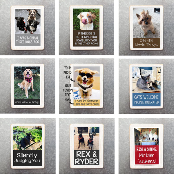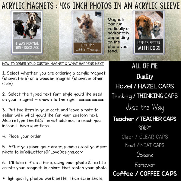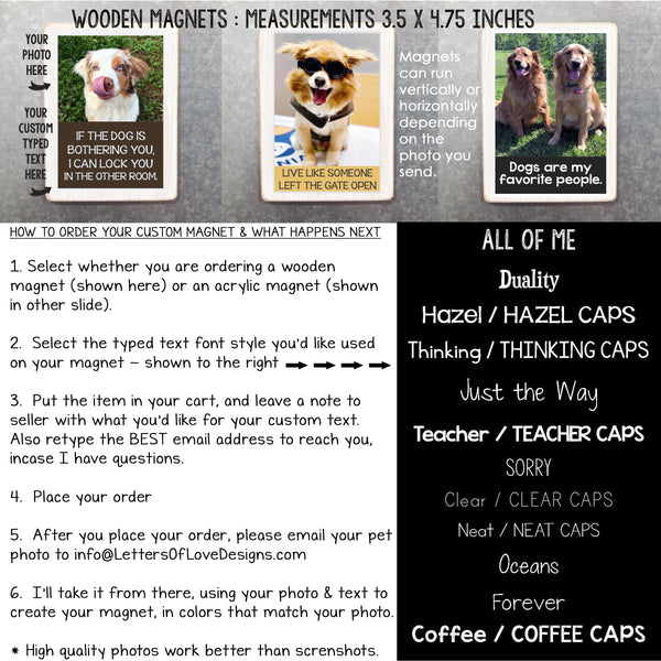 I use YOUR pet photo and any typed text that YOU want, and design the text and layout, and handmake the finished product.