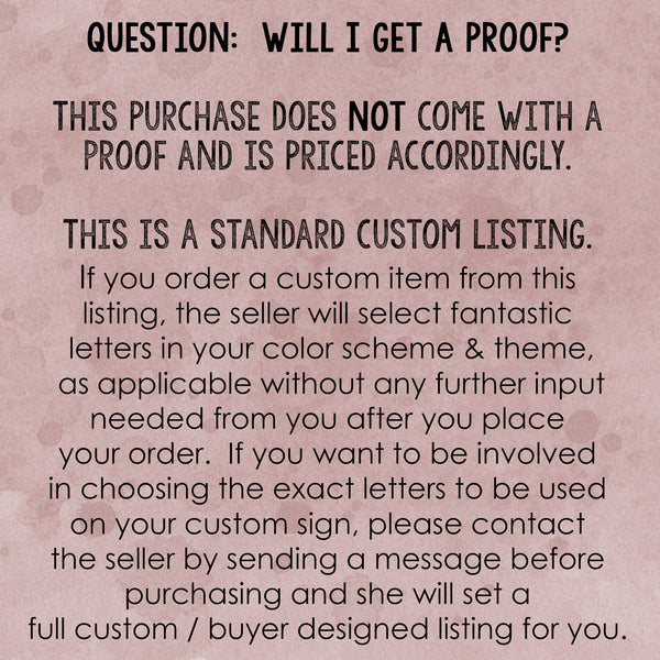 This listing is for basic custom signs - which means the SELLER (me) will choose fantastic letters for your signs with no further input needed from you.