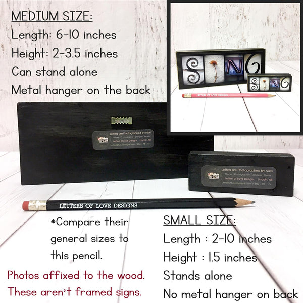 I make the wood signs, as well - I cut the wood, sand, and paint it. I apply my original photo letter collage to the wood, and a protective coat over the top for an added layer of protection.